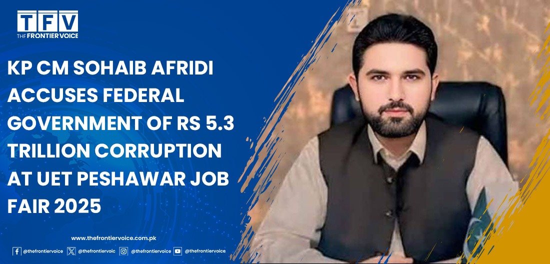 Chief Minister of Khyber Pakhtunkhwa, Muhammad Sohaib Afridi, made serious allegations against the federal government while addressing the Job Fair 2025 at the University of Engineering and Technology (UET) Peshawar, where he served as the chief guest. Afridi claimed that the federal government has committed corruption worth Rs 5,300 billion, asserting that “none of them brought money from their homes—this is the public’s tax money, and they are using it to buy islands abroad.”