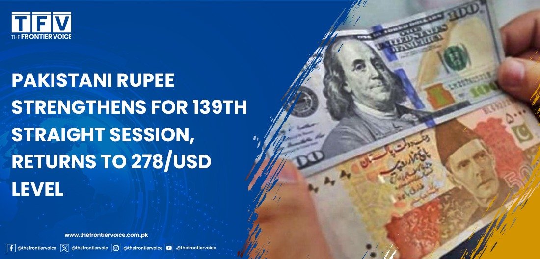 The Pakistani Rupee (PKR) continued its upward trend against the US Dollar (USD), closing in the green for the 139th consecutive trading session on Tuesday. The currency settled at 278.97 per dollar after gaining three paisas during the day.